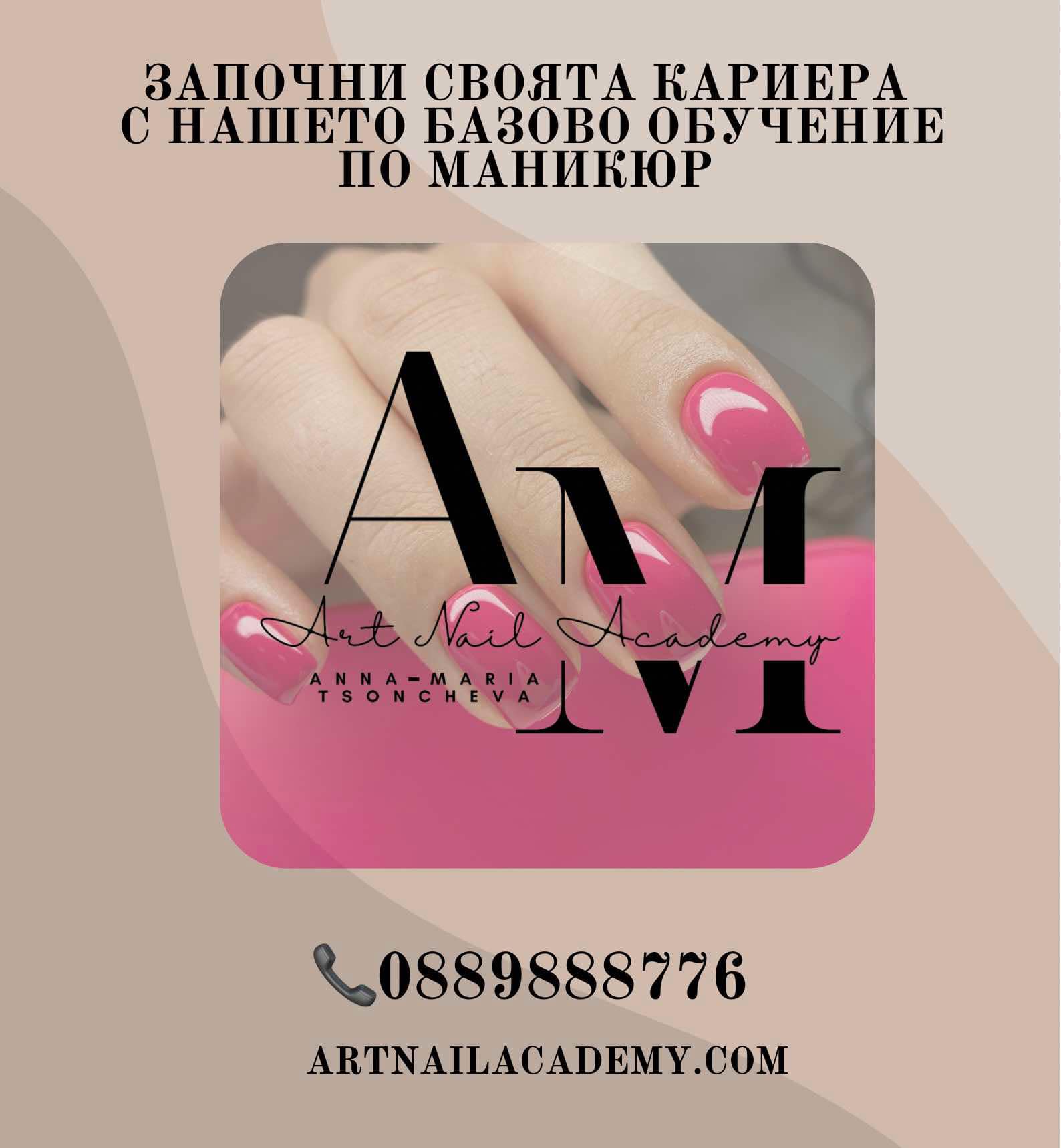 Казвам се Анна-Мария Цончева маникюрист/ педикюрист от повече от 8 години. Превърнах моето хоби в професия, защото маникюрът за мен е страст и истинско удоволствие. Не спирам да надграждам знанията и уменията си в сферата. Имам множество изкарани курсове и спечелени международни състезания. Завършила съм инструкторска дейност по маникюр и педикюр в Частен професионален колеж "Богоя" гр.Варна. Опита, който натрупах през годините ще ми помогне да създам едни от най-добрите професионалисти в моята академия. За мен ще е чест да ми се доверите за Вашето професионално развитие! Очаквам Ви💅📈❤️